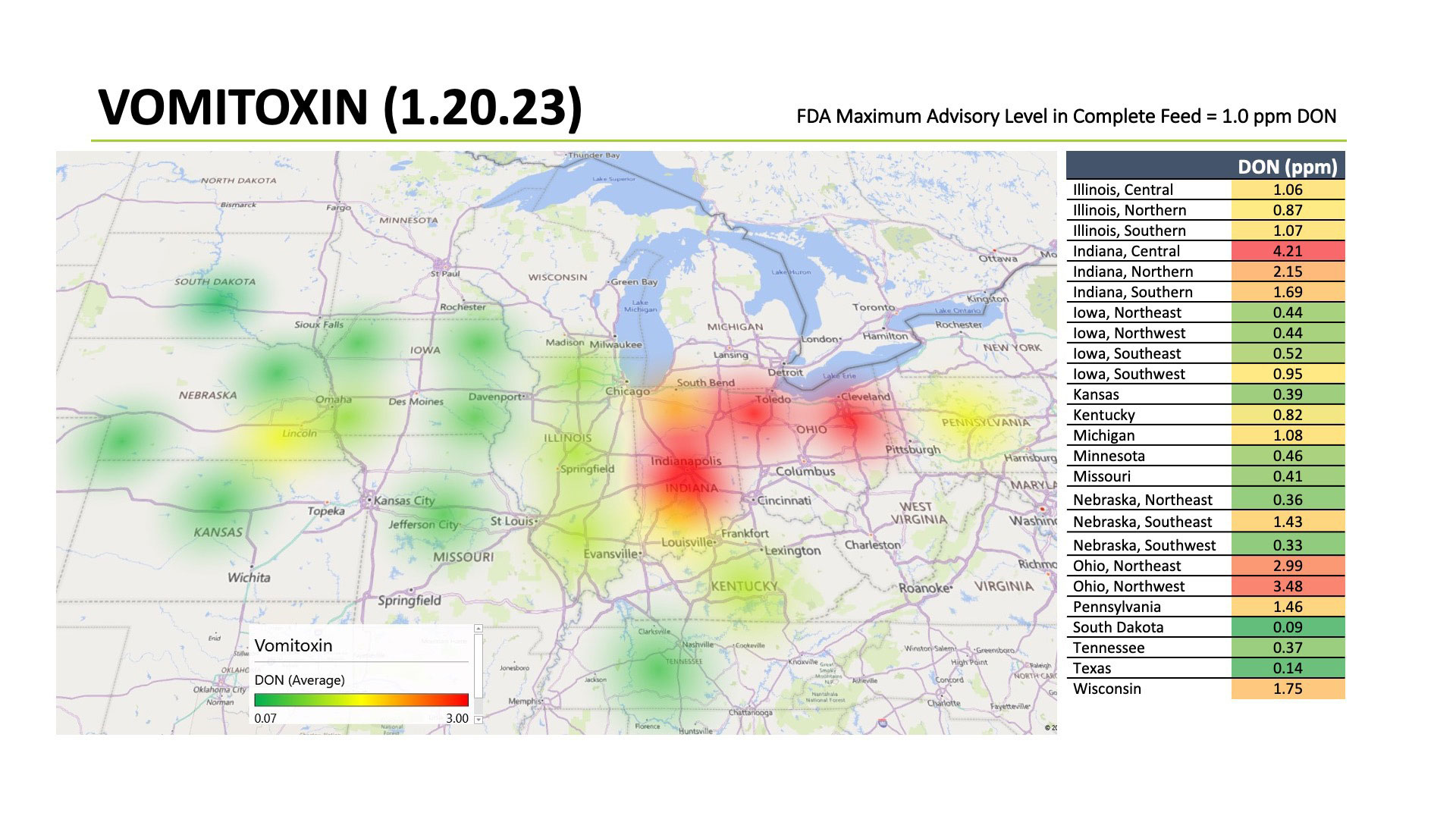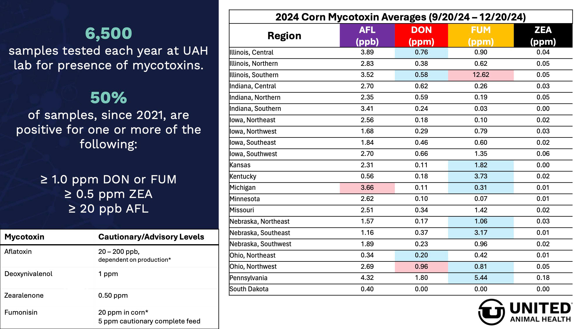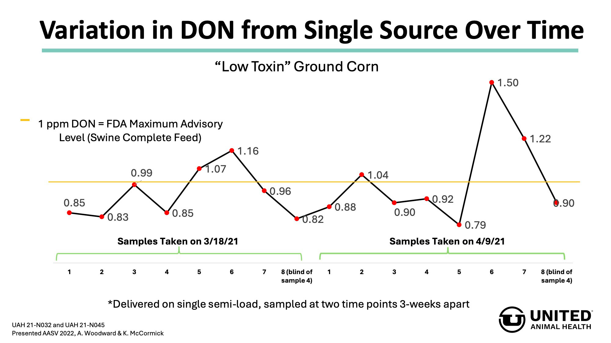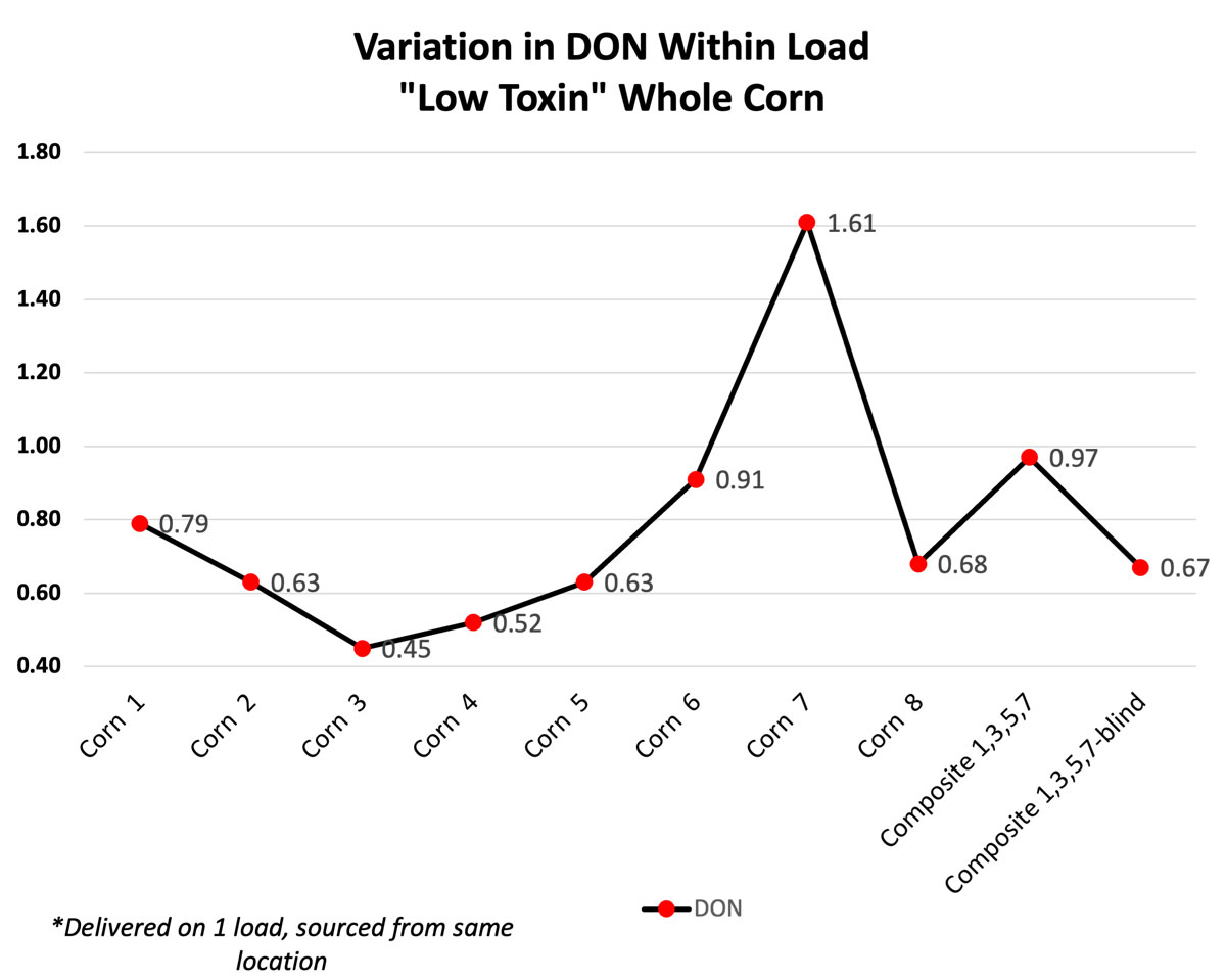 In a recent study conducted by United Animal Health where 8 corn samples were taken from a single semi-load, vomitoxin variation ranged from 0.45 ppm.