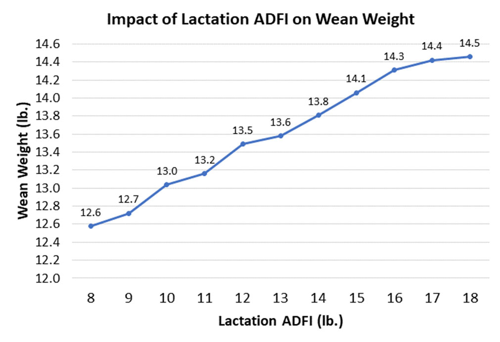 On average, for every 1 lb. of additional sow lactation average daily feed intake = 0.19 additional lbs. of wean weight per pig.