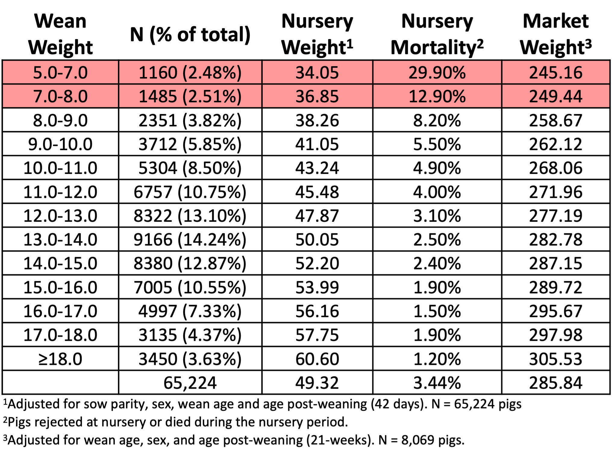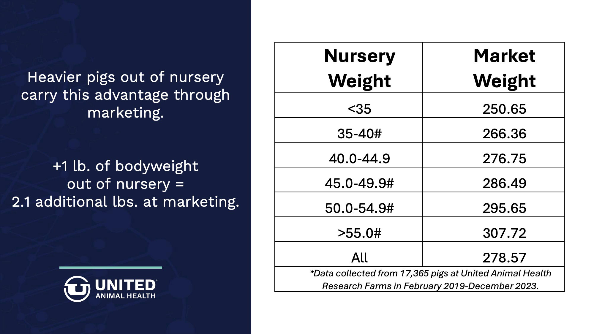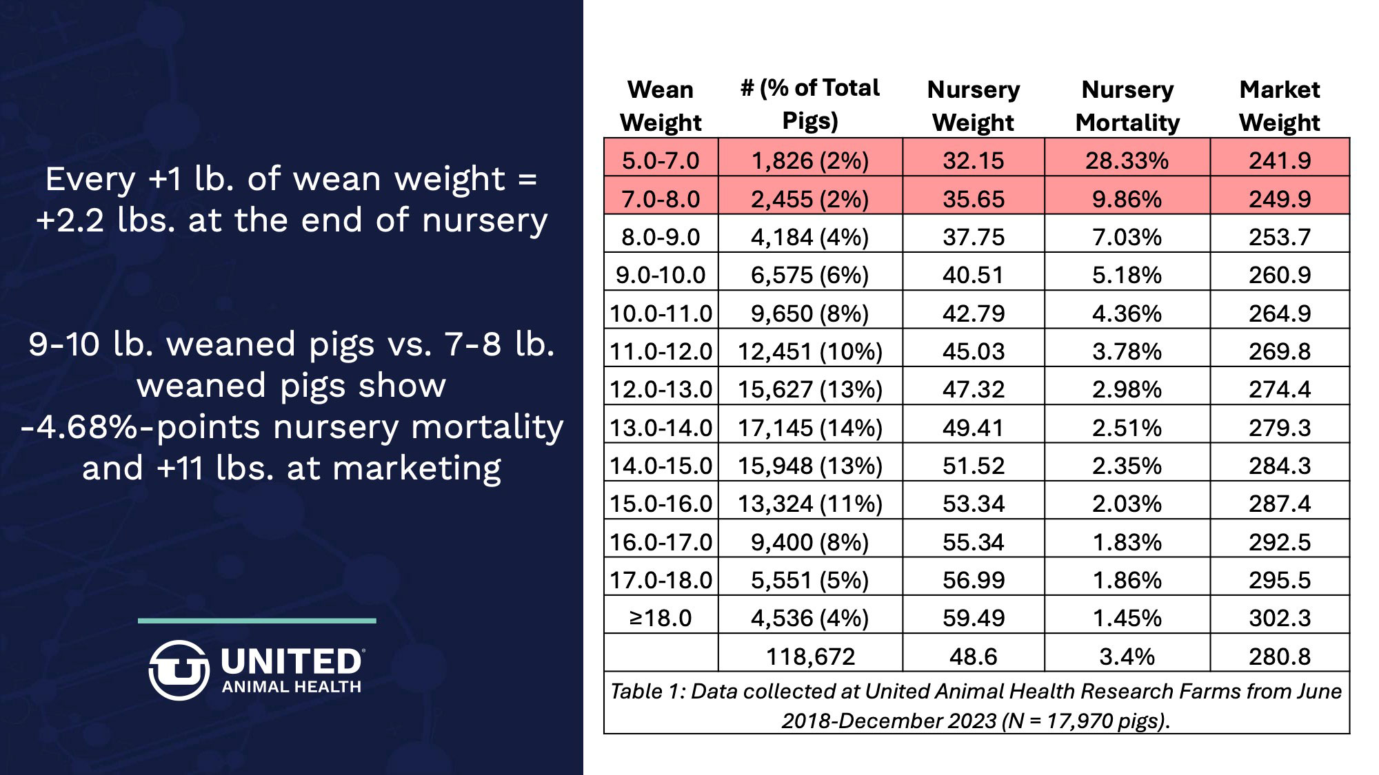 Evaluating more than 17,000 individual pigs from birth to marketing at United Animal Health research farms has shown that implementing strategies to increase wean weights results in reduced nursery mortality and increased weights at end of nursery and marketing.
