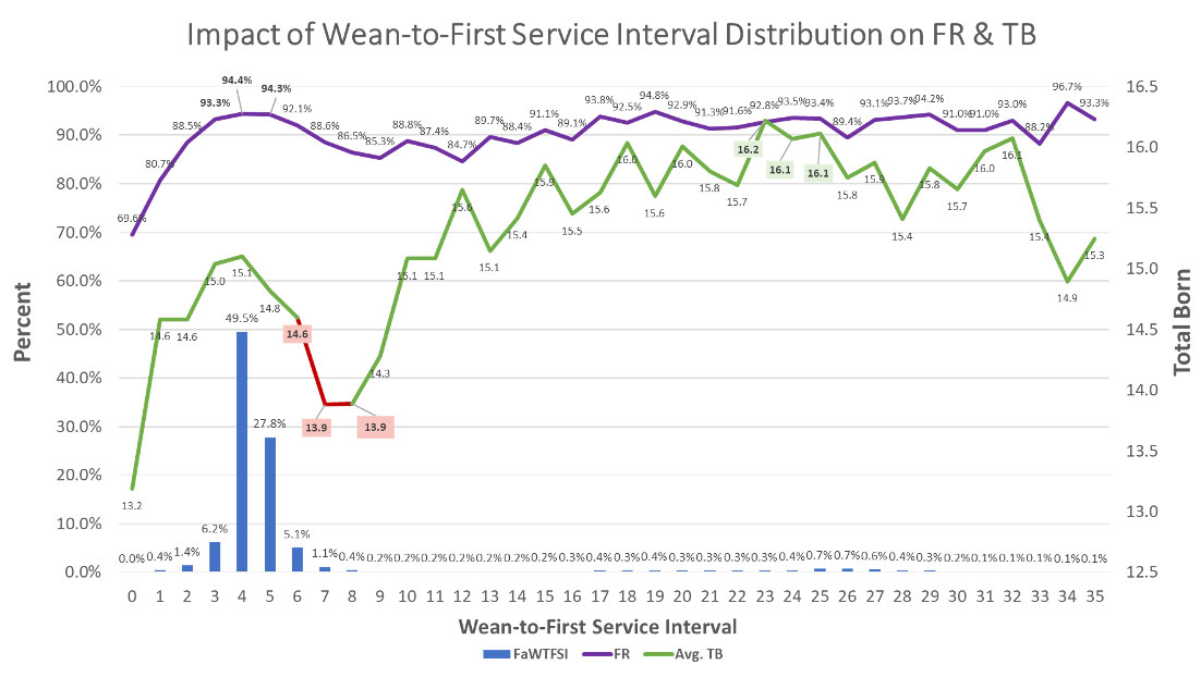 Traditional methods of measuring % of sows in heat by day 7 post-weaning hides valuable opportunity. In evaluating more than 47,000 sow records in a Midwestern production system, measuring the distribution of WTFSI by day shows how shifting more sows inside day 5 can positively impact sow reproductive fitness.