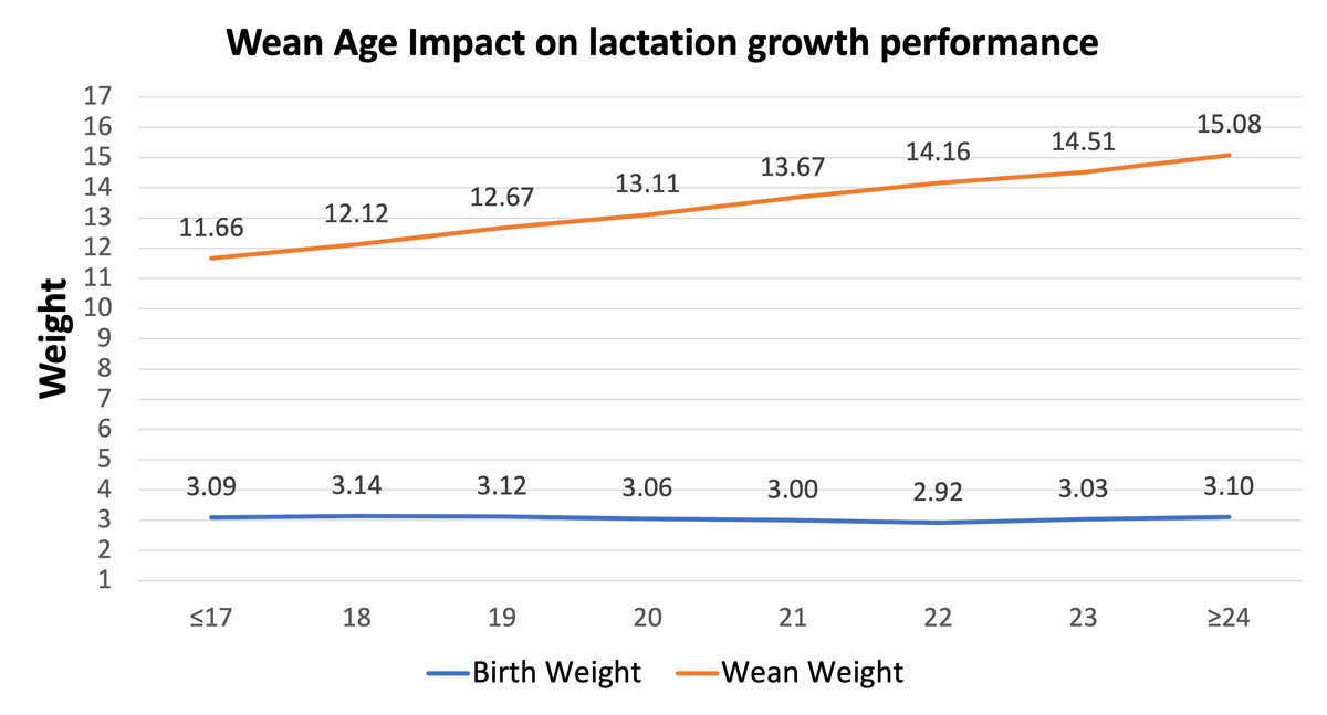 When feasible, extending lactation and increasing wean age can be a tool to improve nursery performance. United Animal Health research shows each additional day over 16-days results in a 0.51 lb. increase in average wean weight. Results based on more than 9,830 litters and 126,000 individual pigs evaluated through United Animal Health research farms.