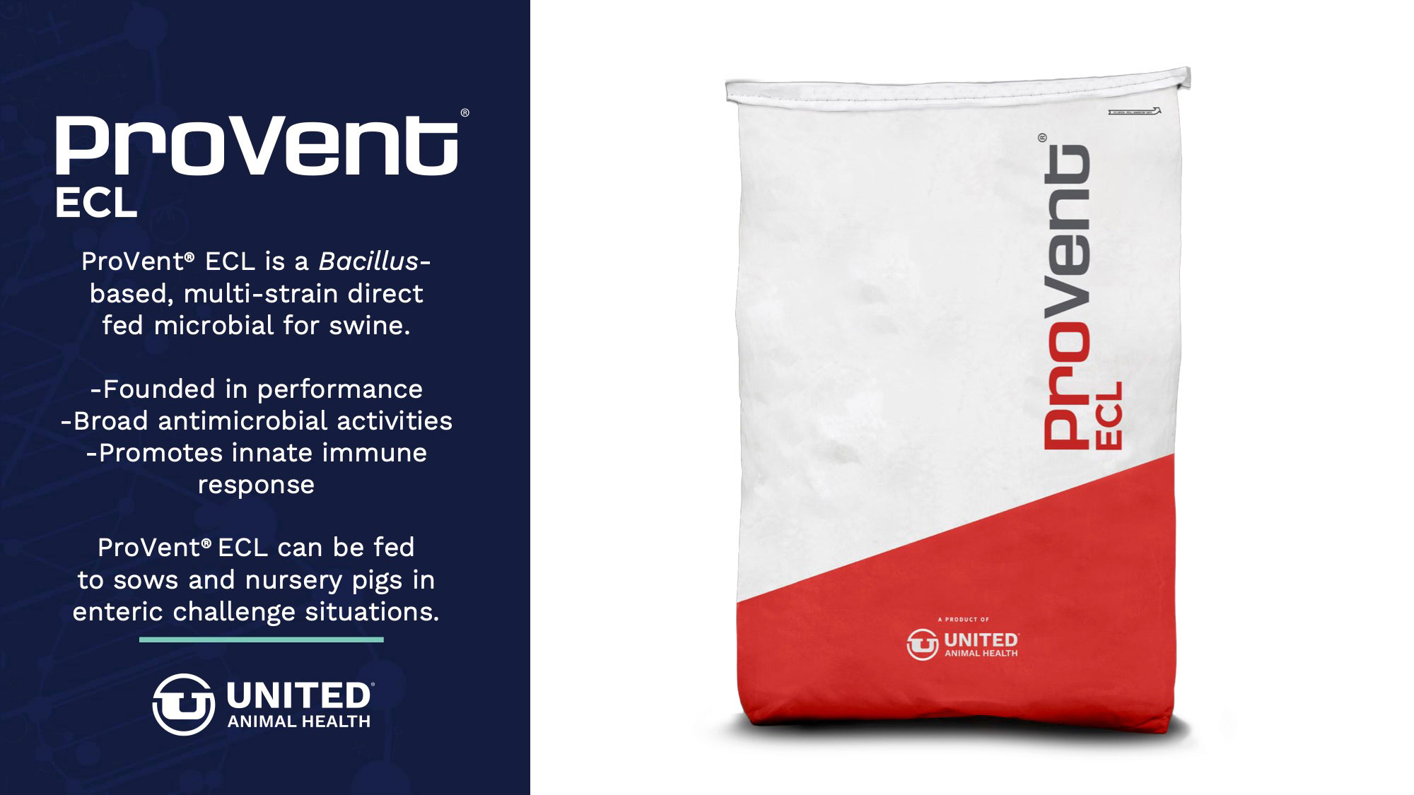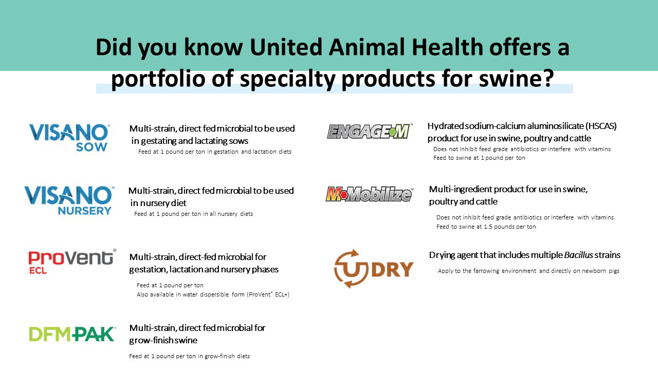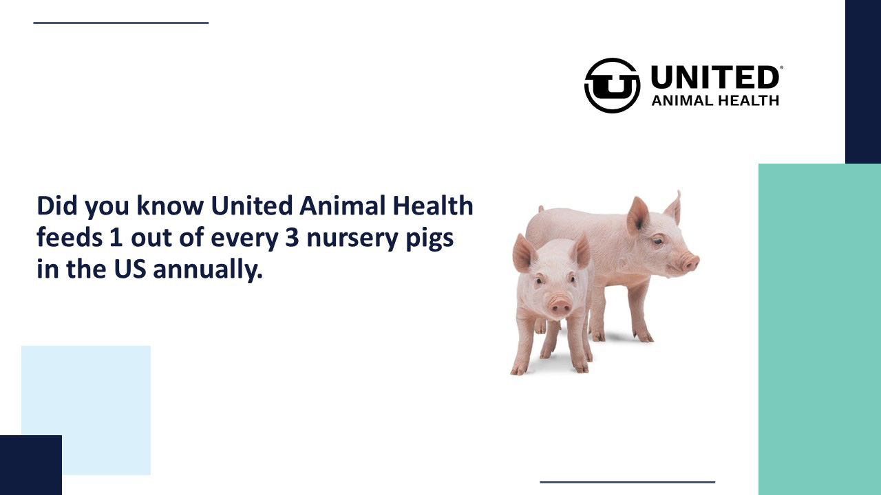 United Animal Health’s Swine Nursery Products are formulated to promote early intake and growth, while providing research-backed novel and proprietary nutritional blends of dairy and protein products, prebiotics, probiotics, botanicals and easily-digestible carbohydrate ingredients to maximize gut health and support natural defenses.