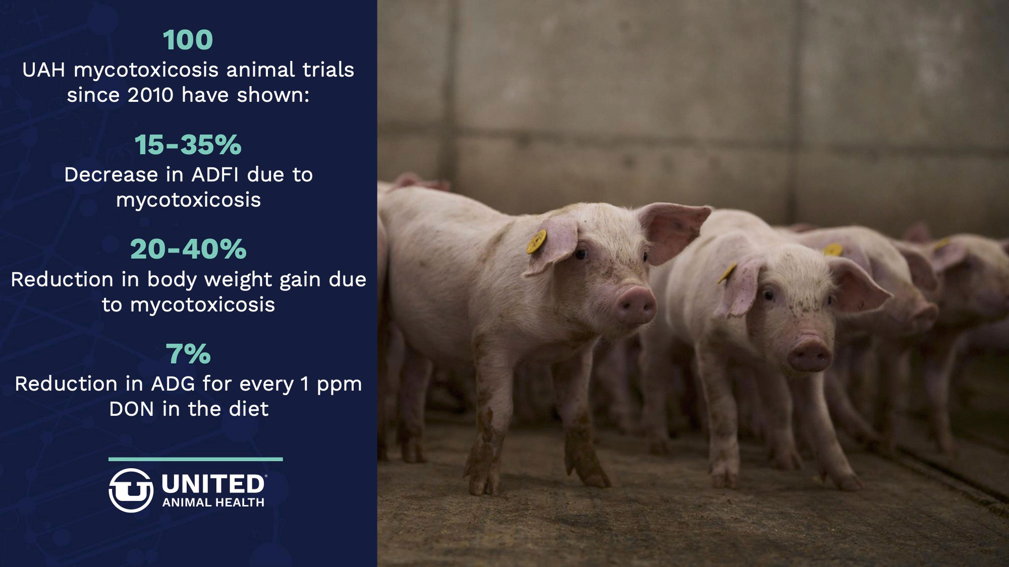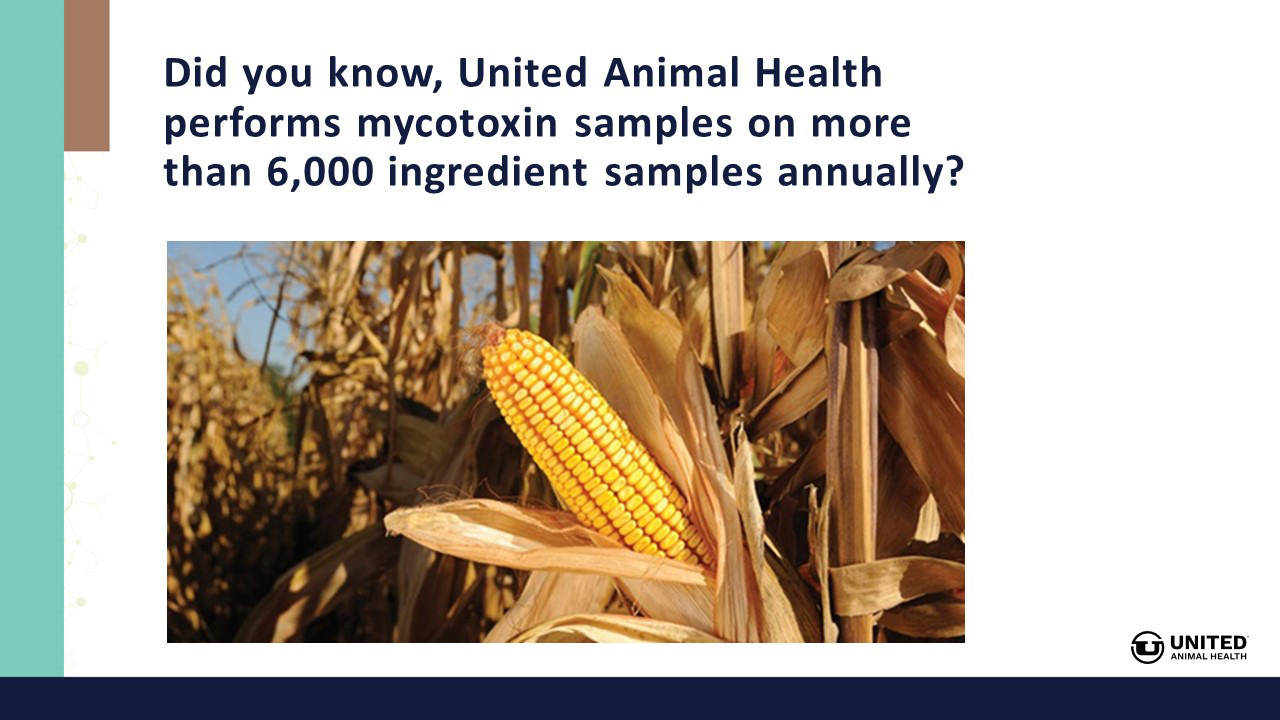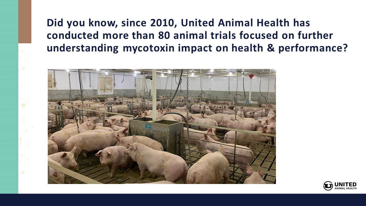 Since 2010, United Animal Health's mycotoxin research includes more than 80 animal trials focused on understanding mycotoxins' impact on health and performance.