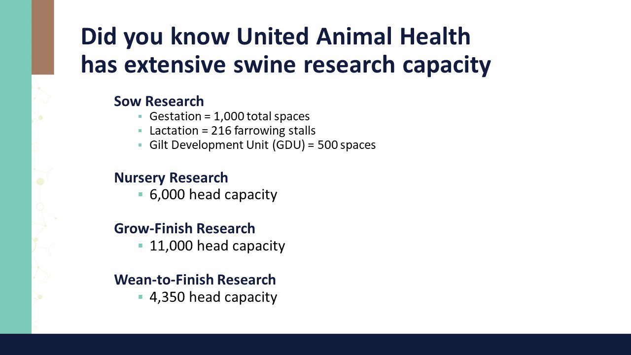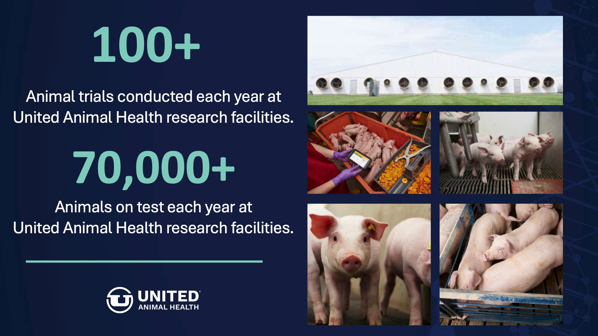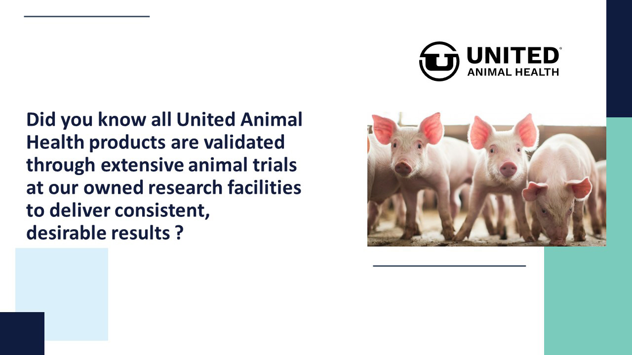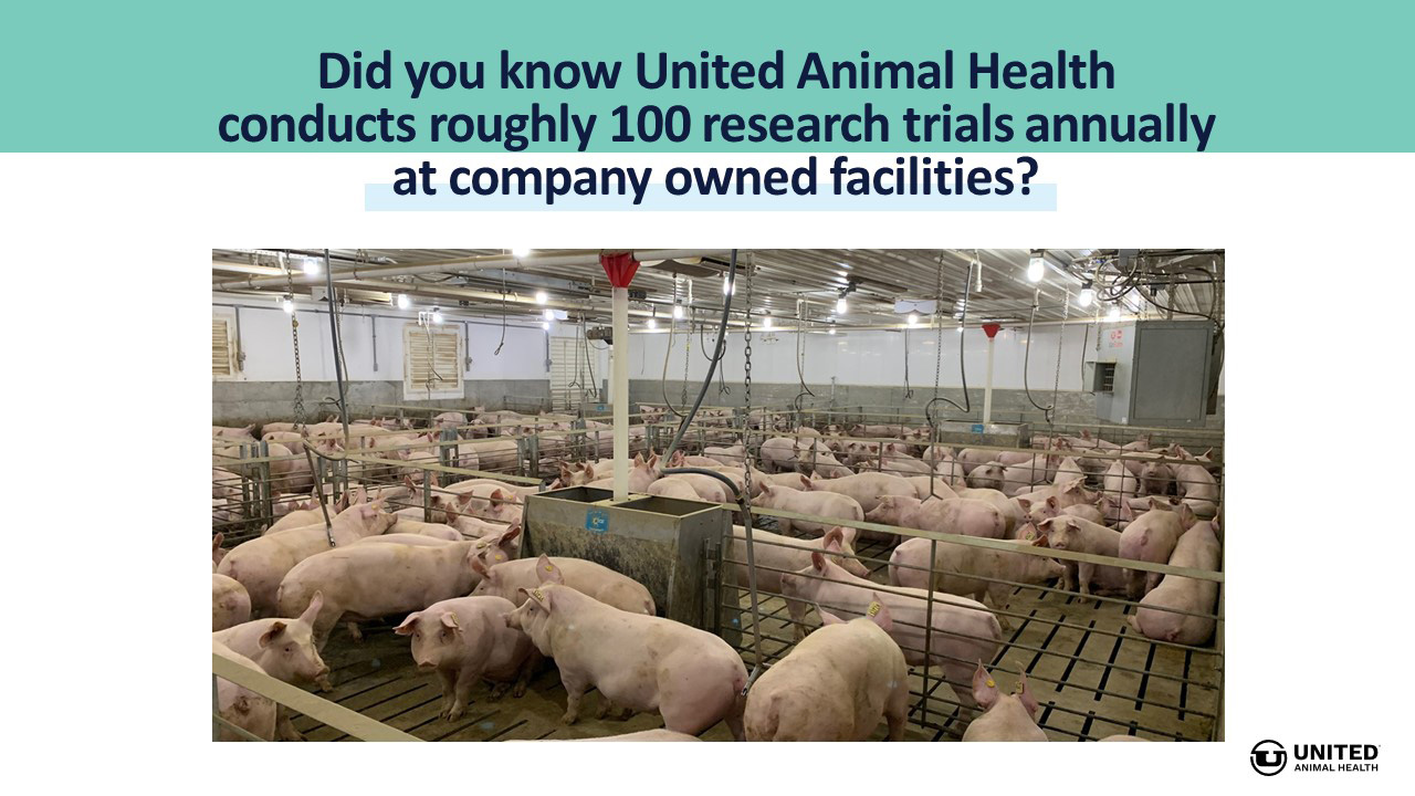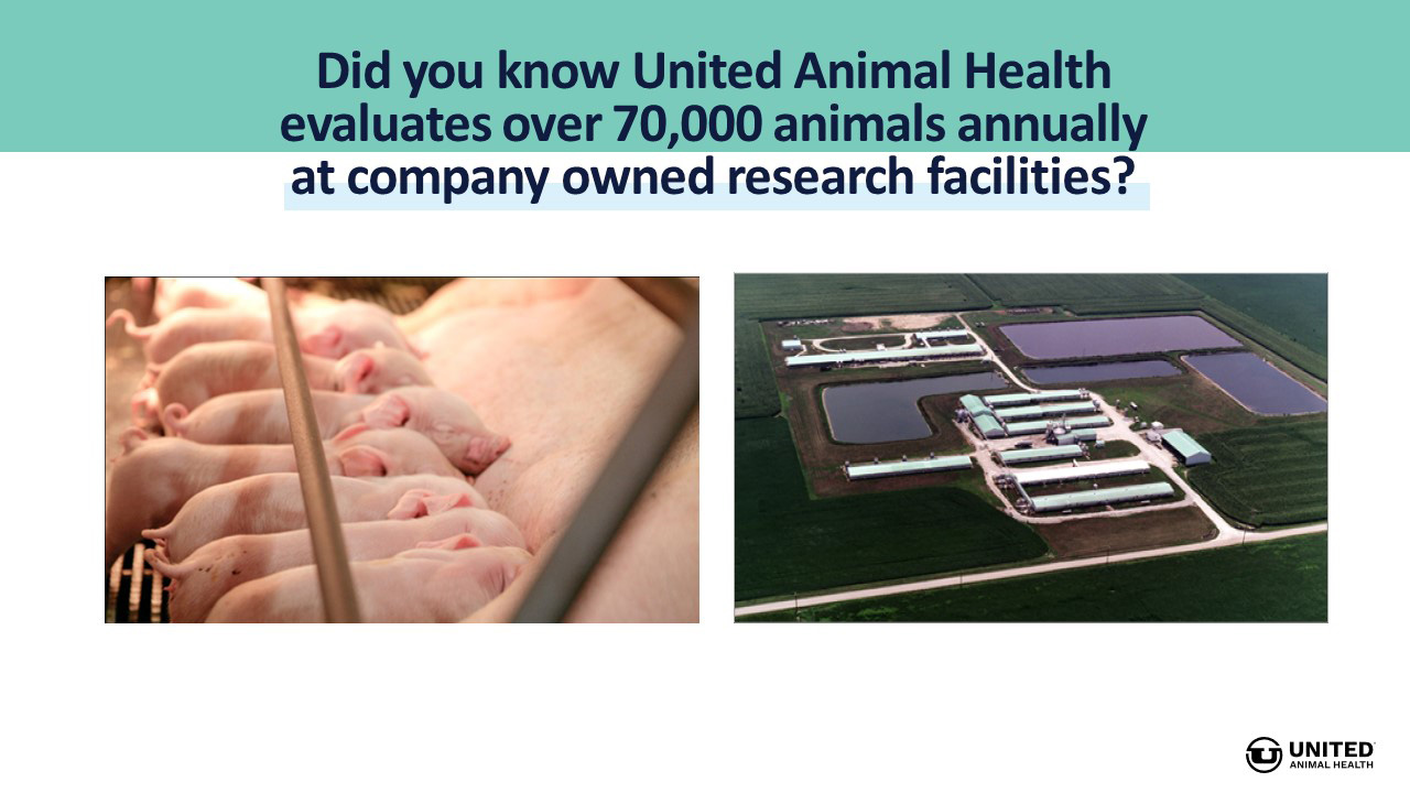 United Animal Health evaluates over 70,000 animals on-test annually on through roughly 100 research trials on swine, poultry and ruminants.
