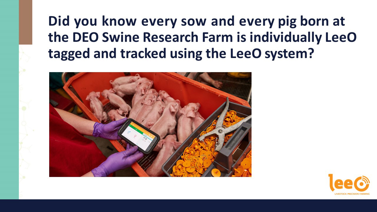 Every sow and pig born at the DEO Swine Research Farm is tagged using LeeO: an RFID smart-tagging system that allows for automatic data capture and tracking of the individual animal from birth to harvest without manual data input.