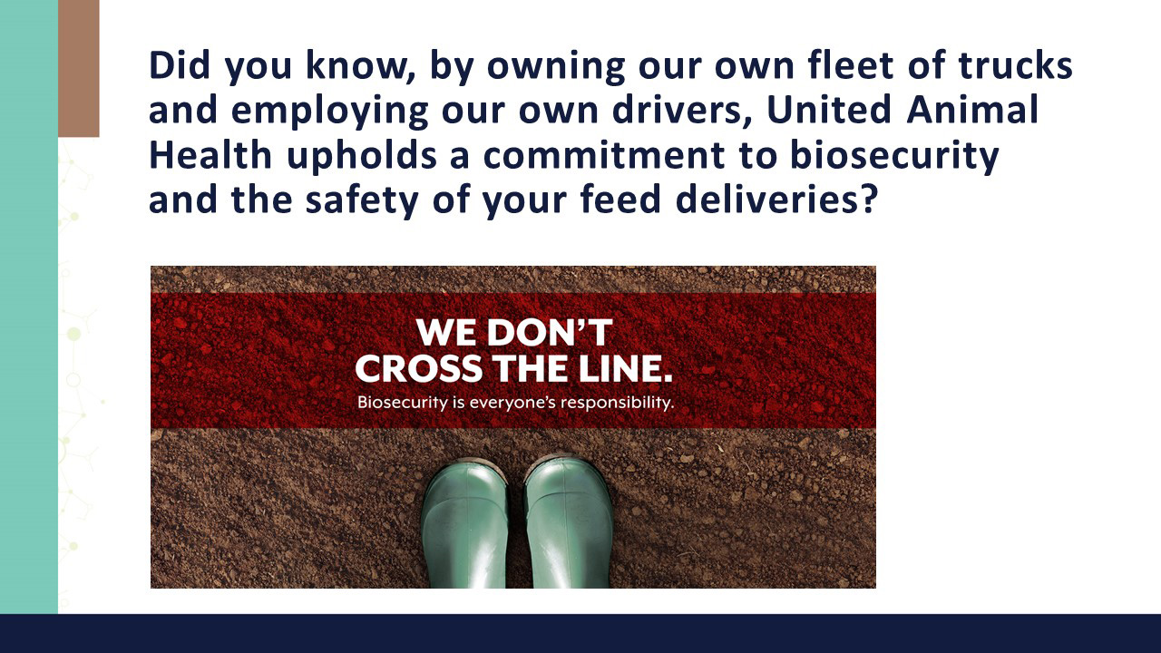 United Animal Health upholds a commitment to biosecurity and the safety of feed deliveries by owning our own fleet of trucks and employing our own drivers.
