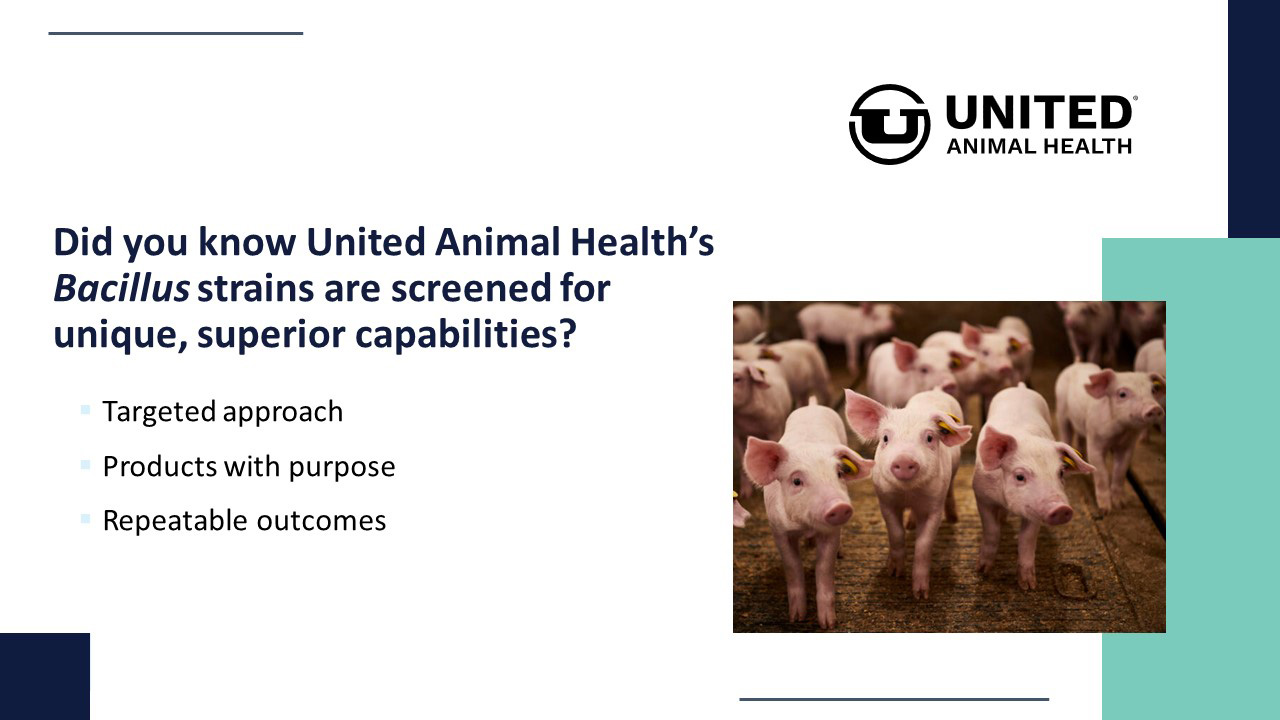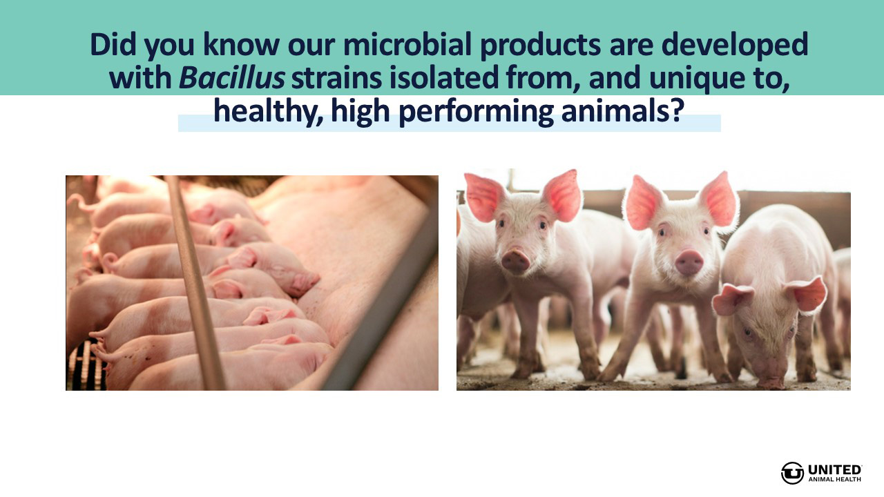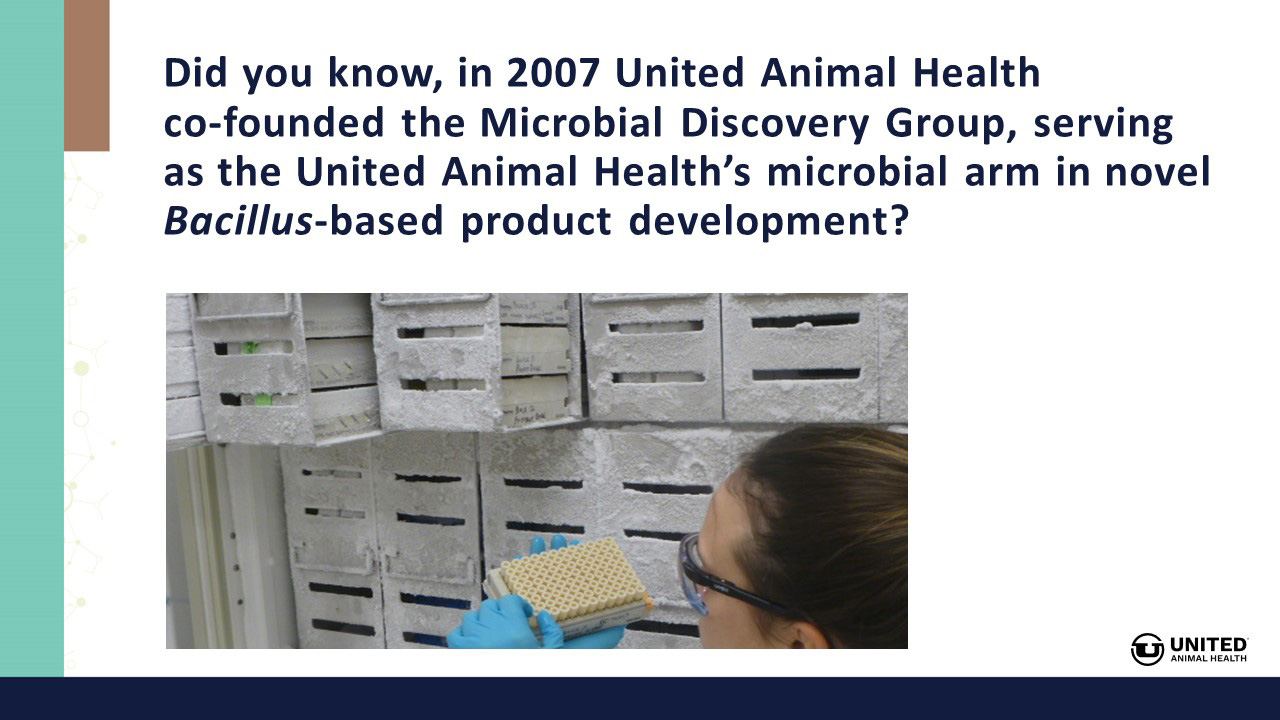 In 2007, United Animal Health co-founded the Microbial Discovery Group, serving as the United Animal Health’s microbial arm in novel Bacillus-based product development. All Bacillus strains in United Animal Health products are selected from healthy, high performing animals.